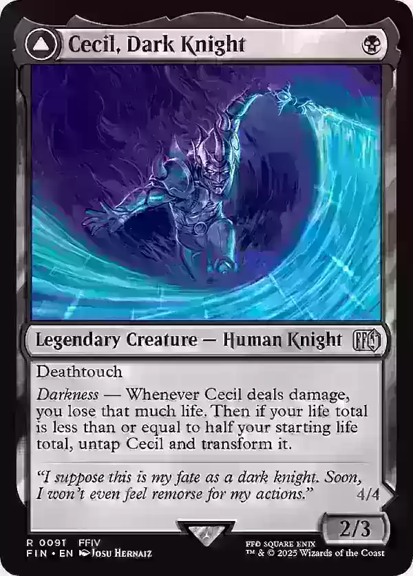 La présentation d’aujourd’hui met en lumière les éléments uniques du set, incluant les Invocations, les premières créatures Saga de Magic que les joueurs peuvent appeler en combat, comme on le voit avec Invocation : Shiva dans la galerie. Les cartes à double face font également leur retour, illustrées par les deux formes de Cecil : Chevalier Noir et Paladin Rédempté.