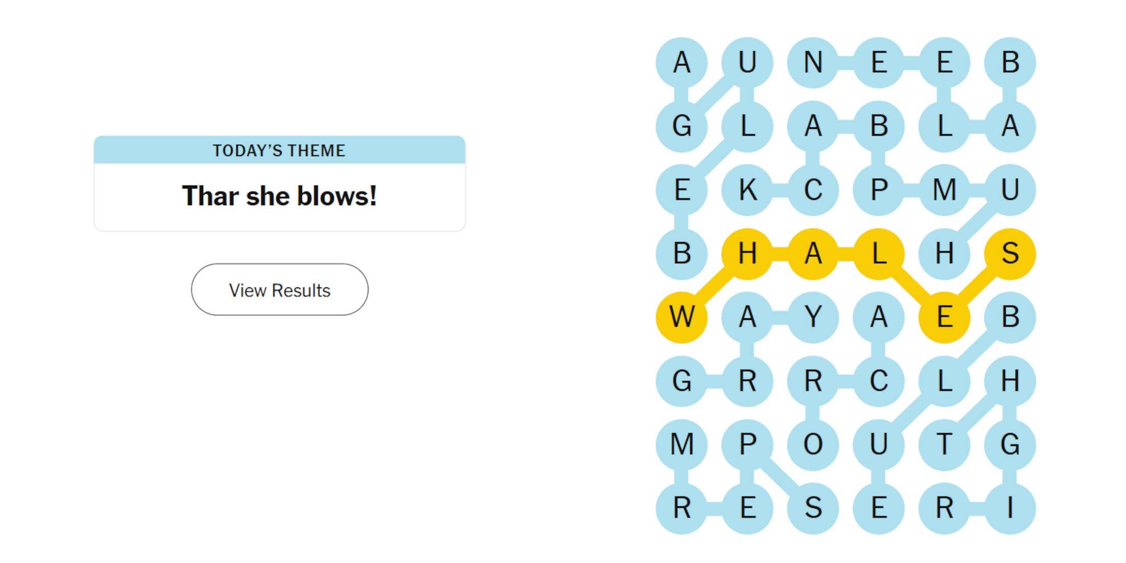 Le puzzle Strands d'aujourd'hui présente neuf éléments à localiser : le Spangram et huit mots thématiques. L'indice pour celui-ci est "Thar She Blows!"
