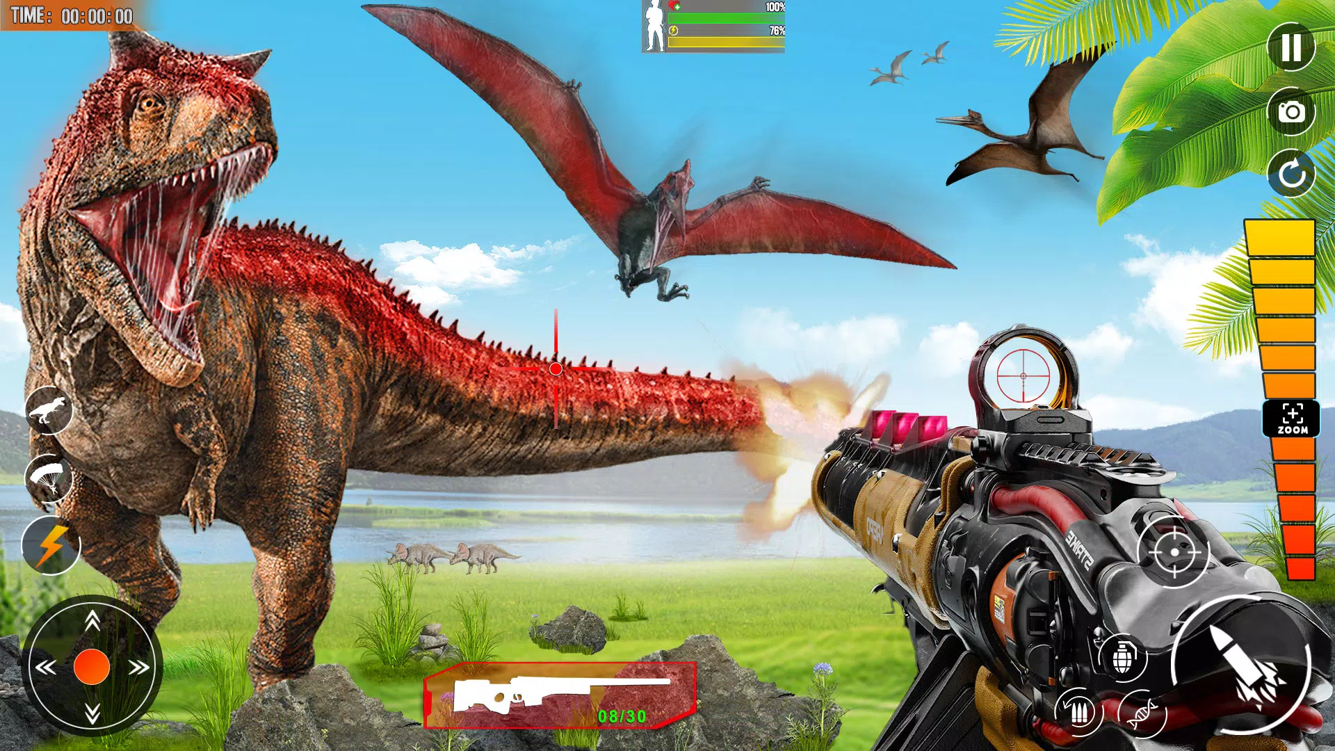 As you progress through the dinosaur hunting games, you'll face various challenges, including dangerous predators, hazardous terrain, and unpredictable weather conditions. Utilize your skills and quick thinking to overcome these obstacles and achieve your objectives. Beyond capturing dinosaurs, you'll also be responsible for their care, ensuring they are well-fed and happy. Engage in intense action as you shoot at the dino squad attacking from all sides, proving your expertise in dino shooting games. With challenging missions, stunning graphics, and the thrill of dino sim, Wild Dino Shooter Zoo Hunter promises endless entertainment in dinosaur hunting games.